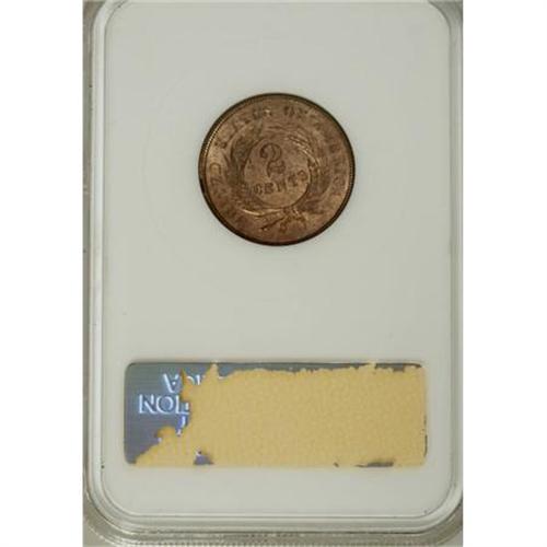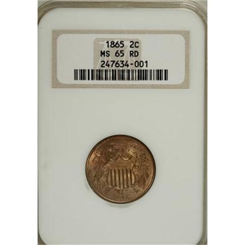 <B>1865 2C MS65 Red NGC.</B></I> Plain 5. A pleasing Gem that has held onto its honey-gold color throughout the years. It is impressively struck throughout, further enhancing the eye appeal. A few flecks on the obverse margin are of little consequence. In a former generation holder.<BR><BR><B>Coin Engraver:</B> James B. Longacre<BR><BR><b>Shipping:</b> Coins & Currency (<a target="_blank" href="http://www.heritageauctions.com/common/shipping.php">view shipping information</a>)