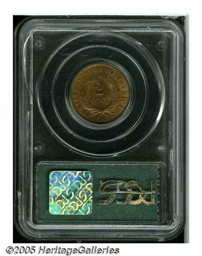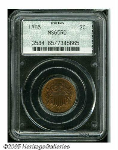<B>1865<2C> MS65 Red PCGS.</B></I> Fancy 5. A crisply struck and unmarked honey-gold Gem. The upper central obverse offers hints of rose-red color. Housed in an elusive doily label holder.
