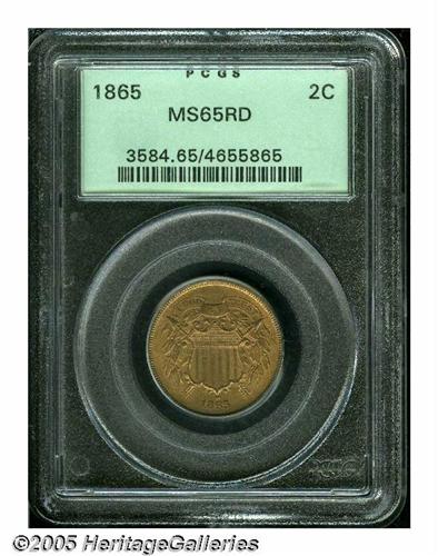 <B>1865<2C> MS65 Red PCGS.</B></I> Fancy 5. Lustrous and well struck, with rich red-orange toning and matte-like surfaces that are carefully preserved and abrasion-free. A very modest degree of carbon is scattered over the reverse, but the obverse is nearly carbon-free.