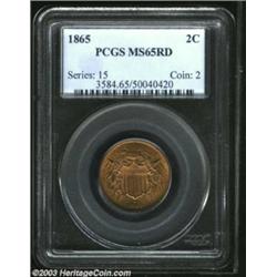 1865 2C MS65 Red PCGS. Those on the hunt for a great type coin should look no further since this Classic Gem with its fully red surfaces and bold strike. Some tiny carbon spots are seen under magnification, but these do little to distract the viewer from this Gem's many charms. Important notice: We expect to be auctioning lots at the rate of 200-250 per hour. On occasion eBay live bid software cannot keep up with the pace of the auctions where 4-5 lots per minute can hammer down, so we recommend that you place a realistic absentee bid now as insurance to avoid disappointment. Also please note that all Heritage/CAA lots purchased through eBay Live carry a 20% Buyer's Premium. Please make sure you read the Terms and Conditions.