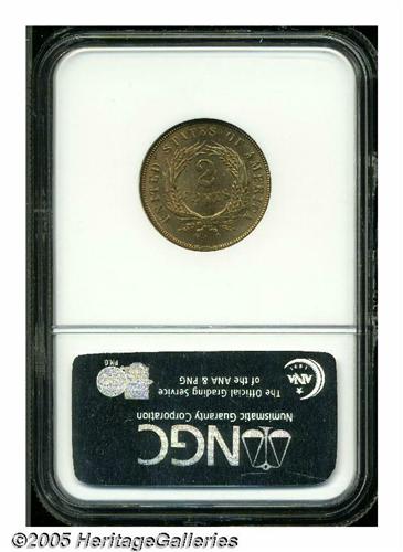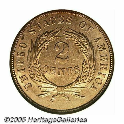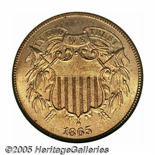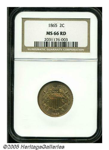 <B>1865<2C> MS66 Red NGC.</B></I> Plain 5. A splendidly preserved Two Cent piece with completely intact mint color. Close examination with a glass reveals some minor die clashing at the center of the reverse, otherwise a perfect copper coin struck at the end of the Civil War. Population: 22 in 66, 0 finer (4/05).