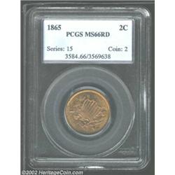1865 2C MS66 Red PCGS. Bright honey-gold and olive colors. A razor-sharp Gem with immaculate surface