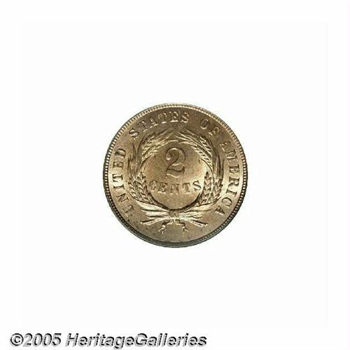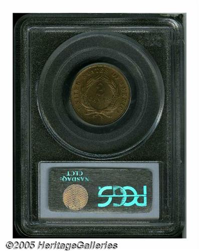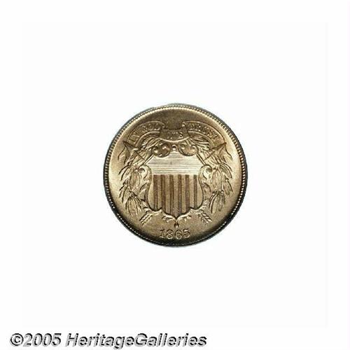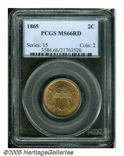 <B>1865<2C> MS66 Red PCGS.</B></I> Fancy 5. In every series there is one issue that stands out as better produced and more widely saved than others. In the Two Cent series, the 1865 is such an issue. This is an exquisite coin that has full red, undimmed mint red luster over each side. Additionally, the striking details are fully brought up, and there are no obvious post-striking impairments or distracting carbon spots on either side. A perfect type coin candidate. Population: 40 in 66, 2 finer (5/05).