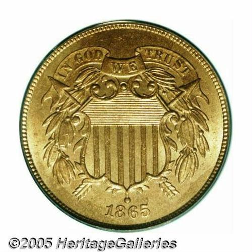 <B>1865<2C> MS66 Red PCGS.</B></I> Fancy 5 in date. A shimmering honey-gold Gem, well struck and nearly unmarked with no distracting carbon. The 5 is double punched. Certified in an older green label holder.
