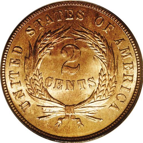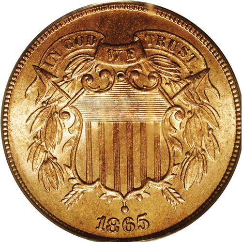 <B>1865<2C> MS66 Red PCGS.</B></I> Plain 5. A pristine, essentially carbon-free representative that has been meticulously preserved since its manufacture 141 years ago. Every device boasts razor sharp definition and a radiant, frosty sheen emanates from unmellowed surfaces. If the ultimate two cent piece is on your wish list, here is such a coin. Housed in an earlier PCGS holder with a green insert. Population: 40 in 66, 2 finer (4/06).