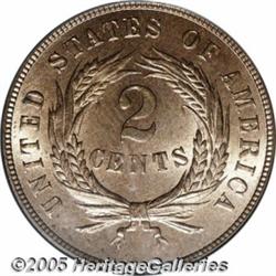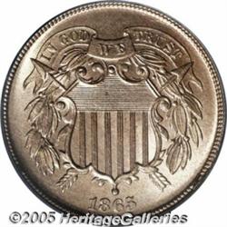 <B>1865 2C MS66 Red PCGS.</B></I> In every series there is one issue that stands out as better produced and more widely saved than others. In the Two Cent series, the 1865 is such an issue. This is an exquisite coin that has full red, undimmed mint red luster over each side. Additionally, the striking details are fully brought up, and there are no obvious post-striking impairments or distracting carbon spots on either side. A perfect type coin candidate. Population: 39 in 66, 2 finer (2/05).