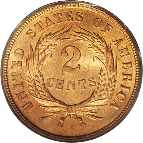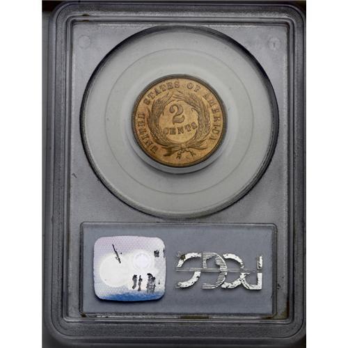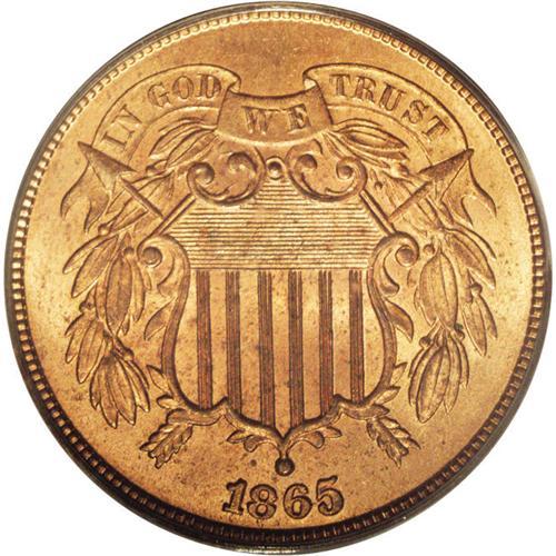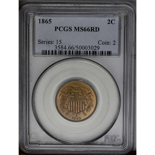 <B>1865<2C> MS66 Red PCGS.</B></I> Plain 5. KF-P7-TPD. The date is lightly repunched. Lovely orange-gold color, with lustrous and essentially unabraded surfaces. Only a solitary flyspeck is detected, beside the C in AMERICA. The 1864 and 1865 issues constitute the majority struck for this 10-year type. Population: 40 in 66 Red, 2 finer (6/06).