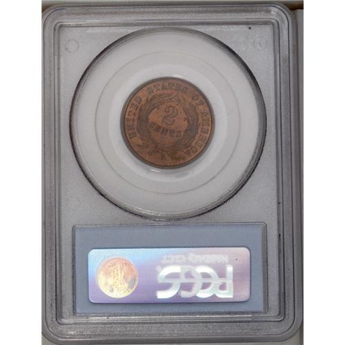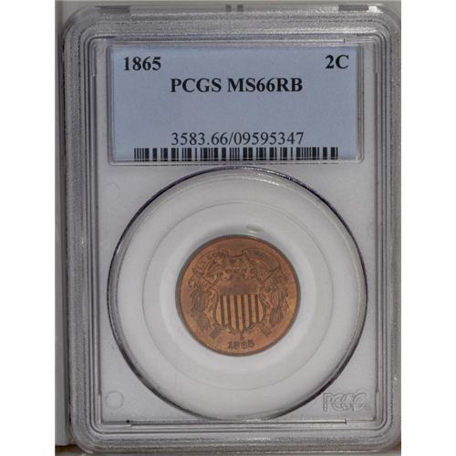 <B>1865<2C> MS66 Red and Brown PCGS.</B></I> Fancy 5. KF-F15-RPD. The date is lightly repunched on this peach-red coin. Sharply struck and highly lustrous, though slightly mellowed in color near 12 o'clock and on the central reverse.
