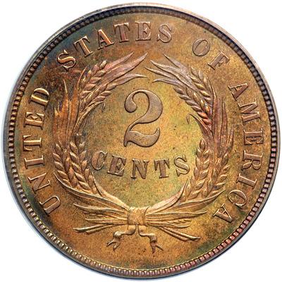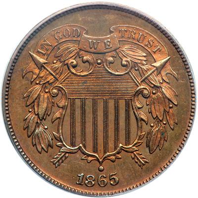 1865 Two Cents. PCGS graded Proof 65 Red & Brown. Only 500+ Proofs struck. Attractive multi-dimensional toning is displayed on both sides. Pop 27; 11 finer in 66 (PCGS # 3628) .