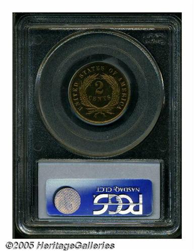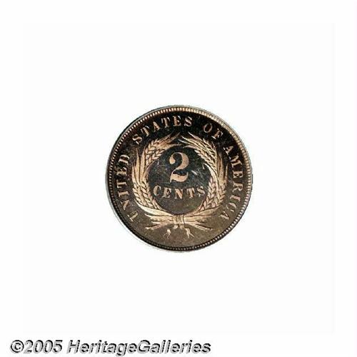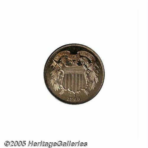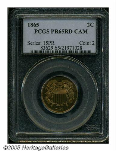 <B>1865<2C> PR65 Red Cameo PCGS.</B></I> Plain 5. Honey and rose colors endow this meticulously struck and unabraded Gem. An occasional pinpoint toning fleck is of little consequence. Although the 1865 is a common date as a business strike, proofs are very scarce, and are rarely encountered with full Red color and noticeable cameo contrast.
