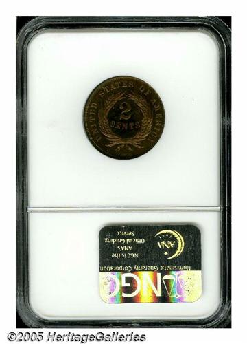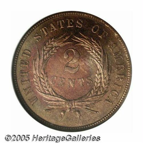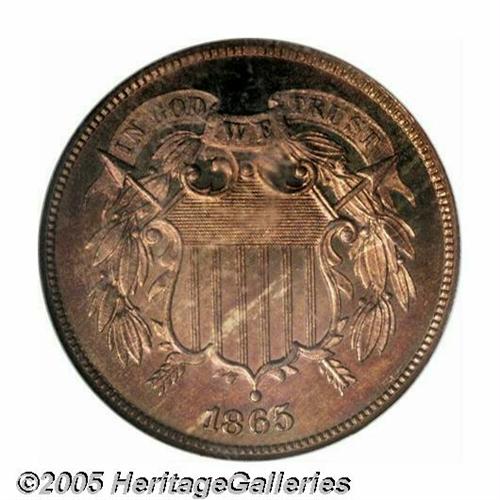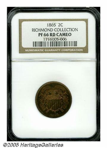 <B>1865<2C> PR66 Red Cameo NGC.</B></I> Richmond Collection. Second year of issue for this odd-denomination, an estimated 500 proofs were struck of the 1865 but far fewer are known today, especially with full red color and Premium Gem surfaces. This is an immaculate, unhairlined, and unquestionably original Gem proof. The surfaces have an iridescent quality, combining original orange-red with deep cherry-red and an occasional dash of lime-green and lilac. Deeply reflective, the surfaces show no obvious carbon spots on either side. Very rare as such and sure to be of keen interest to knowledgeable collectors of 19th century proof coinage.