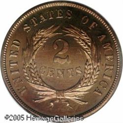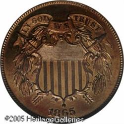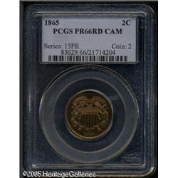 <B>1865 2C PR66 Red Cameo PCGS.</B></I> A truly stunning example that appears conservatively graded, with fiery-red surfaces that display no spotting and a pronounced cameo effect. This example also displays superb eye-appeal and virtually no blemishes. Original coins with such splendid characteristics rarely appear on the market, and when they do they are certain to generate intense bidding interest. Lot:5634
