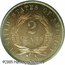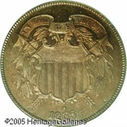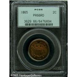 <B>1865 2C PR66 Red PCGS.</B></I> A fiery-red example of this interesting denomination. The surfaces are deeply reflective and absent of any mentionable marks. The color is even, deep, and mesmerizing, with no visible carbon spotting on either side. Population: 9 in 66, 0 finer (1/05). Lot:5633