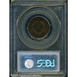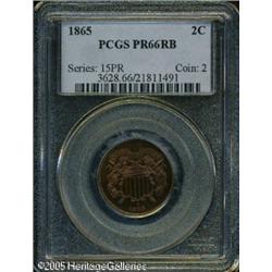 <B>1865 2C PR66 Red and Brown PCGS.</B></I> Reddish-orange patina displays touches of tan on the reverse. The design elements are well struck up, and there are no mentionable marks to report. Population: 6 in 66, 0 finer (1/05). Lot:5632