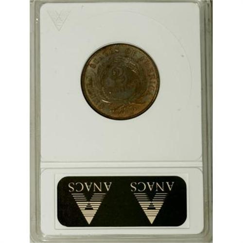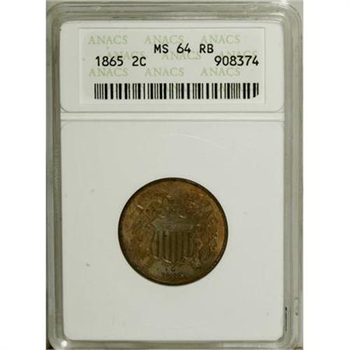 <B>1865 2C MS64 Red and Brown ANACS.</B></I> MS64. NGC Census: (293/367). PCGS Population (523/234). Mintage: 13,640,000. Numismedia Wsl. Price for NGC/PCGS coin in MS64: $260. (#3583)<BR><BR><B>Coin Engraver:</B> James B. Longacre<BR><BR><b>Shipping:</b> Coins & Currency (<a target="_blank" href="http://www.heritageauctions.com/common/shipping.php">view shipping information</a>)