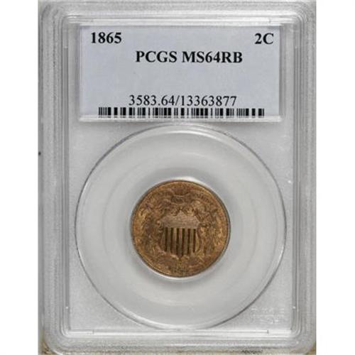 <B>1865 2C MS64 Red and Brown PCGS.</B></I> . PCGS Population (531/244). NGC Census: (298/374). Mintage: 13,640,000. Numismedia Wsl. Price for NGC/PCGS coin in MS64: $275. (#3583)<BR><BR><B>Coin Engraver:</B> James B. Longacre<BR><BR><b>Shipping:</b> Coins & Currency (<a target="_blank" href="http://www.heritageauctions.com/common/shipping.php">view shipping information</a>)