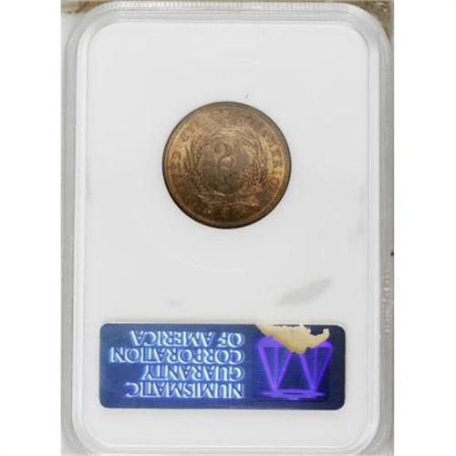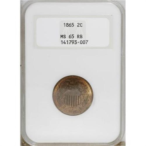<B>1865 2C MS65 Red and Brown NGC.</B></I> NGC Census: (305/68). PCGS Population (225/16). Mintage: 13,640,000. Numismedia Wsl. Price for NGC/PCGS coin in MS65: $460. (#3583)<BR><BR><B>Coin Engraver:</B> James B. Longacre<BR><BR><b>Shipping:</b> Coins & Currency (<a target="_blank" href="http://www.heritageauctions.com/common/shipping.php">view shipping information</a>)