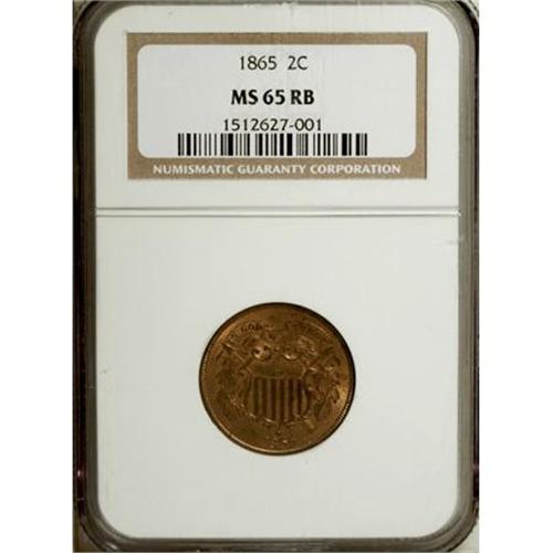 <B>1865 2C MS65 Red and Brown NGC.</B></I> NGC Census: (308/68). PCGS Population (232/16). Mintage: 13,640,000. Numismedia Wsl. Price for NGC/PCGS coin in MS65: $520. (#3583)<BR><BR><B>Coin Engraver:</B> James B. Longacre<BR><BR><b>Shipping:</b> Coins & Currency (<a target="_blank" href="http://www.heritageauctions.com/common/shipping.php">view shipping information</a>)