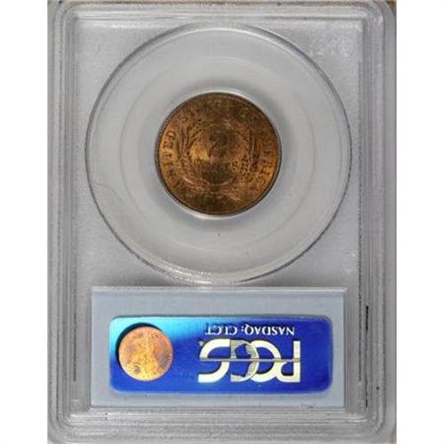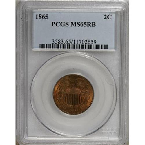 <B>1865 2C MS65 Red and Brown PCGS.</B></I> PCGS Population (218/15). NGC Census: (300/67). Mintage: 13,640,000. Numismedia Wsl. Price for NGC/PCGS coin in MS65: $460. (#3583)<BR><BR><B>Coin Engraver:</B> James B. Longacre<BR><BR><b>Shipping:</b> Coins & Currency (<a target="_blank" href="http://www.heritageauctions.com/common/shipping.php">view shipping information</a>)