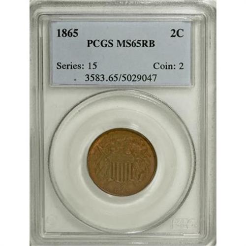 <B>1865 2C MS65 Red and Brown PCGS.</B></I> PCGS Population (225/16). NGC Census: (305/68). Mintage: 13,640,000. Numismedia Wsl. Price for NGC/PCGS coin in MS65: $460. (#3583)<BR><BR><B>Coin Engraver:</B> James B. Longacre<BR><BR><b>Shipping:</b> Coins & Currency (<a target="_blank" href="http://www.heritageauctions.com/common/shipping.php">view shipping information</a>)