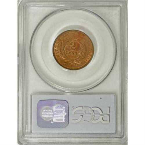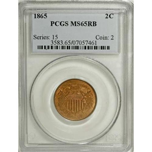 <B>1865 2C MS65 Red and Brown PCGS.</B></I> PCGS Population (226/16). NGC Census: (305/68). Mintage: 13,640,000. Numismedia Wsl. Price for NGC/PCGS coin in MS65: $460. (#3583)<BR><BR><B>Coin Engraver:</B> James B. Longacre<BR><BR><b>Shipping:</b> Coins & Currency (<a target="_blank" href="http://www.heritageauctions.com/common/shipping.php">view shipping information</a>)