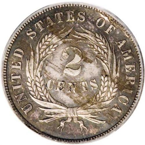 <B>1865 2C Two Cents, Judd-407, Pollock-477, High R.7, PR63 PCGS.</B></I> Experimental trial piece struck from the dies from the 1865 two cent piece. Struck in copper with streaks of silver with a plain edge. These odd die trials were allegedly struck from native Michigan ore that contained both copper and silver. The surfaces of these pieces are quite unusual, as one can tell from the photos on the USPatterns.com website or from examining this piece. A significant amount of silver is seen on the reverse of this die trial. Apparently the native alloy used for these pieces contained a number of imperfections as each side shows extensive cracks and laminations. About a dozen pieces are known. Iridescent red, brown, and blue on the obverse, the reverse is silver-blue in color.<BR><BR><b>Shipping:</b> Coins & Currency (<a target="_blank" href="http://www.heritageauctions.com/common/shipping.php">view shipping information</a>)