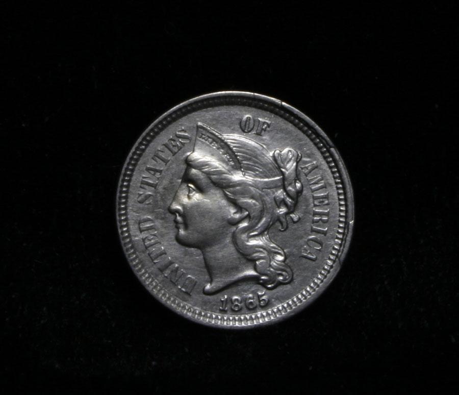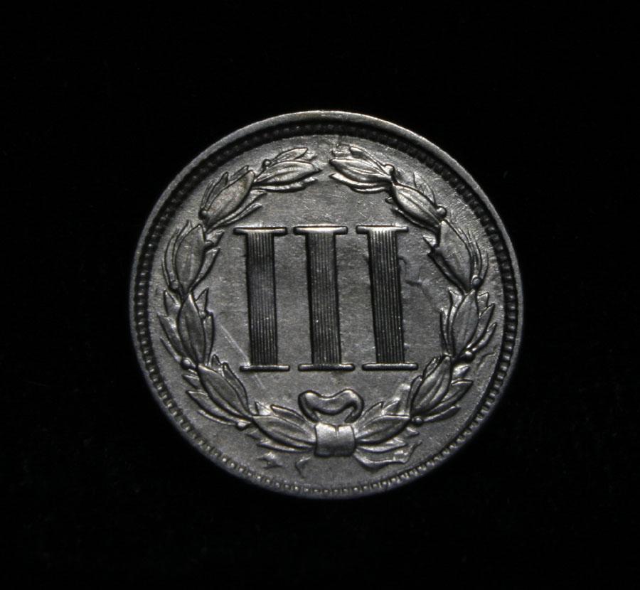 Very interesting coin. It has 2 separate rim cuds on the right obverse. One at 2 O'clock and one at 4 O'clock. I have never seen a 3 cent nickel with 2 separate rim cuds. Select Uncirculated example, of the first year of this type coin. Original created to be used for buying the 3 cent postage of the time. Coin World's Coin Values lists ms63 at $150 and Wholesale Greysheet on ms63 is $115. Estimated Value $125