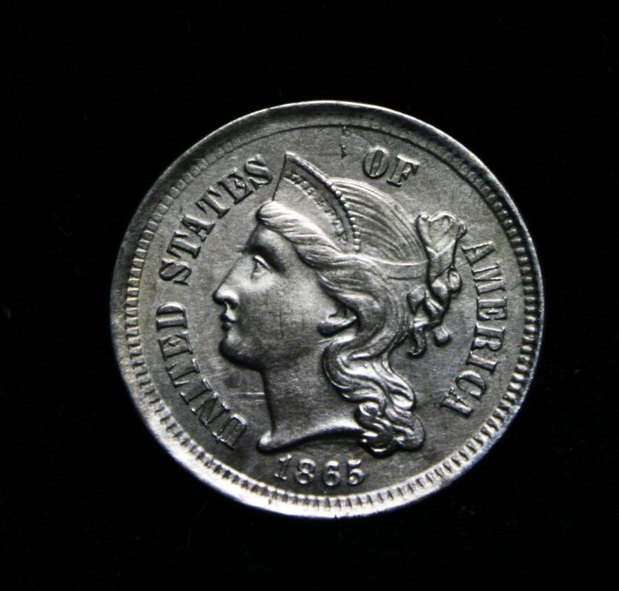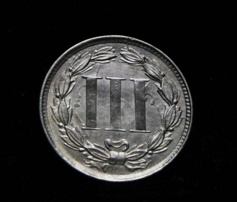 Choice Uncirculated example, of the first year of this type coin. All of the lines making up the roman three on the reverse are struck well and fully separated, very rare for this issue. Originally created to be used for buying the 3 cent postage of the time. Coin World's Coin Values lists ms64 at $250 and Wholesale Greysheet on ms64 is $190. Estimated Value $200