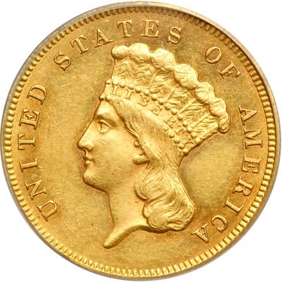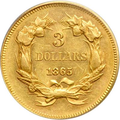 1865 $3 Gold. PCGS graded AU-55 PQ. Lovely golden toning with reflective surfaces. Only 1,140 coins minted and very scarce. A Premium Quality coin for the given numerical grade. Pop 9; 22 finer (PCGS # 7986).