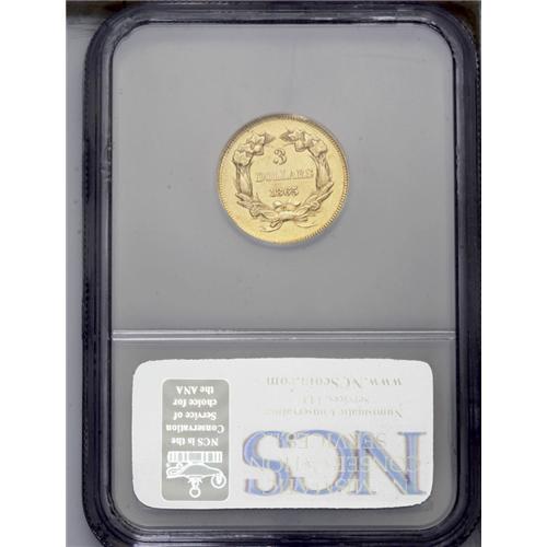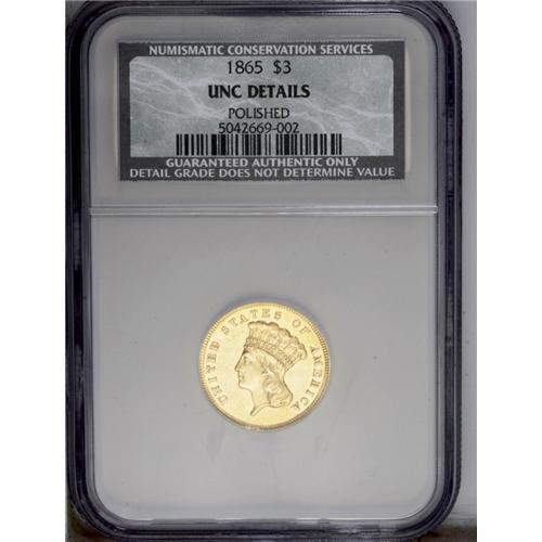 <B>1865 $3 --Polished--NCS. Unc. Details.</B></I> A glossy and bright piece; the fields are moderately reflective, partly due to a wipe from a jeweler's cloth. This Civil War issue has a combined proof and business strike mintage of 1,165 pieces. Well struck and not unduly abraded.