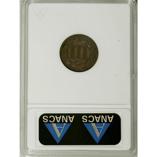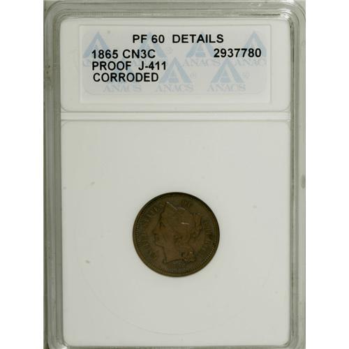 <B>1865 3C Three Cent Nickel, Judd-411, Pollock-482, High R.6--Corroded--ANACS. PR60 Details.</B></I> Similar to the regular issue except the ribbon ends are longer and merge with the lower reverse border. Struck in copper with a plain edge. A lightly hairlined deep golden-brown specimen with minor corrosion at 3 o'clock on the obverse and 10 o'clock on the reverse.<BR><BR><b>Shipping:</b> Coins & Currency (<a target="_blank" href="http://www.heritageauctions.com/common/shipping.php">view shipping information</a>)