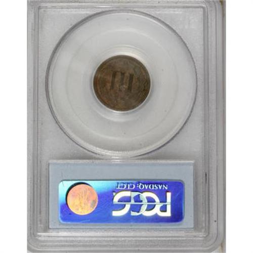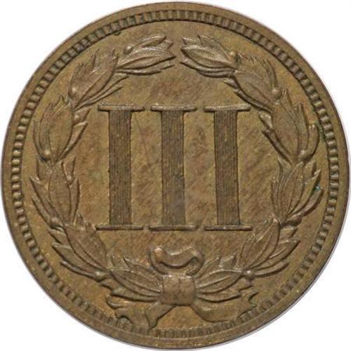 <B>1865 3C Three Cent Nickel, Judd-411, Pollock-482, High R.6, PR64 Brown PCGS.</B></I> Similar in design to the issued three cent nickel, but the ribbon ends extend to the denticles. Struck in copper with a plain edge. Richly toned in medium brown, aqua, and rose shades. A sharply struck and unabraded near-Gem. A wonderful adjunct to a collection of three cent nickels.<BR><BR><b>Shipping:</b> Coins & Currency (<a target="_blank" href="http://www.heritageauctions.com/common/shipping.php">view shipping information</a>)