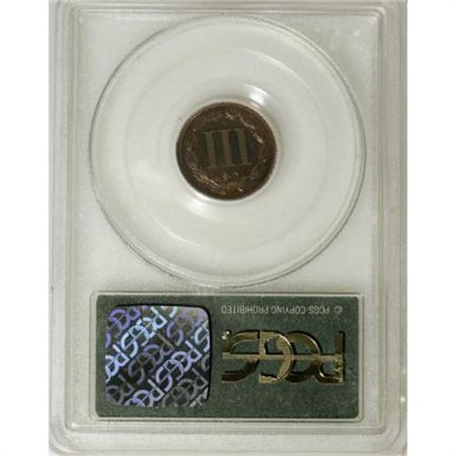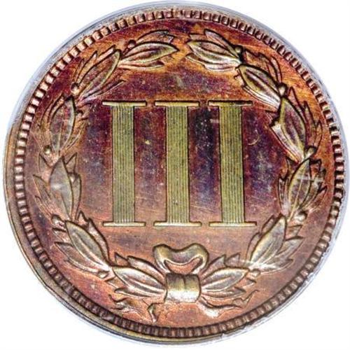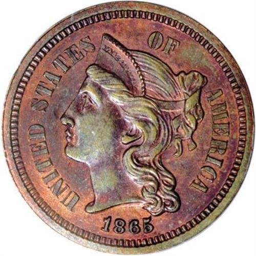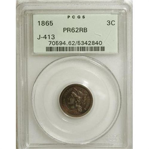 <B>1865 3C Three Cents, Judd-413, Pollock-484, R.5, PR62 Red and Brown PCGS.</B></I> From regular issue dies, but struck in copper with a plain edge. Presumably struck to demonstrate the new designs prior to large-scale production of the series. A well struck and attractive specimen with rose-red and olive-brown toning. A small strike-through (as made) is noted near the nose. Housed in a green label holder.<BR><BR><b>Shipping:</b> Coins & Currency (<a target="_blank" href="http://www.heritageauctions.com/common/shipping.php">view shipping information</a>)