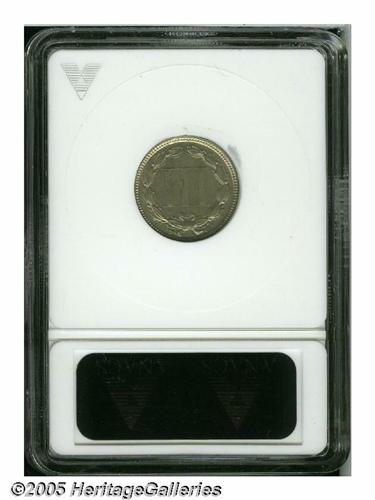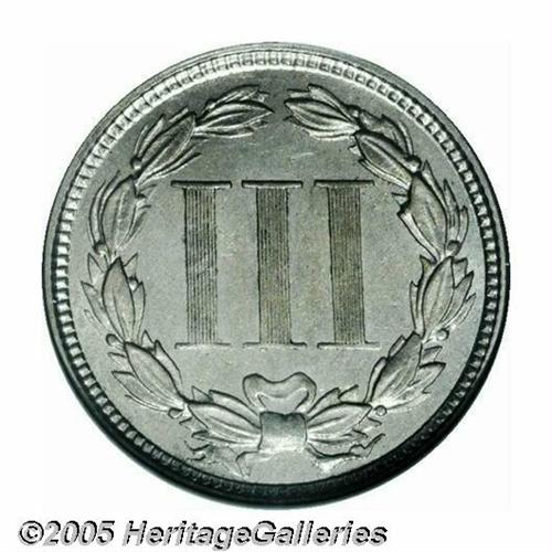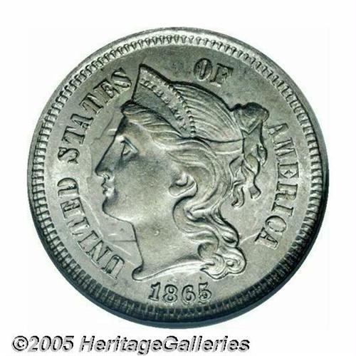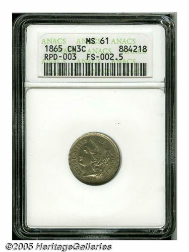 <B>1865<3CN> MS61 ANACS.</B></I> FS-002.5, RPD-003. Boldly repunched on the final three digits. Lustrous gray surfaces with heavy die clashing noted on the obverse.<BR><I>From The Western Hills Collection.</B></I>