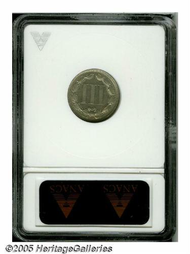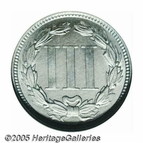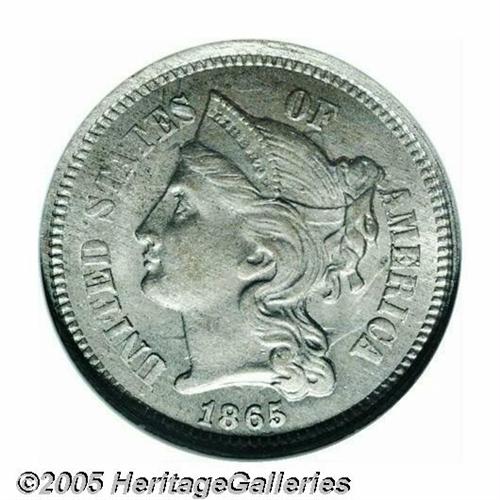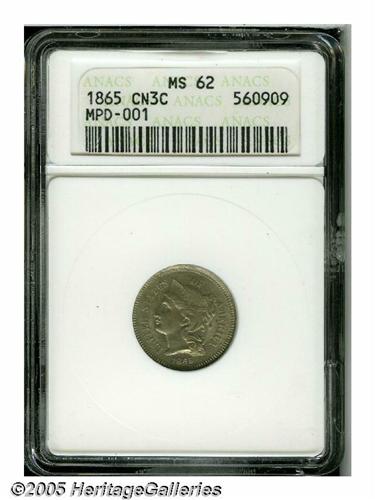 <B>1865<3CN> MS62 ANACS.</B></I> MPD-001. An interesting and unmistakable misplaced date, with the top of an errant 5 sticking up from the denticles between the 6 and the 5. Light, streaky toning, with normal die clashing on the obverse.<BR><I>From The Western Hills Collection.</B></I>