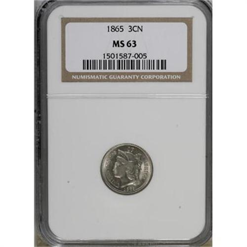 <B>1865 3CN MS63 NGC.</B></I> NGC Census: (315/625). PCGS Population (439/576). Mintage: 11,382,000. Numismedia Wsl. Price for NGC/PCGS coin in MS63: $140. (#3731)<BR><BR><B>Coin Engraver:</B> James B. Longacre<BR><BR><b>Shipping:</b> Coins & Currency (<a target="_blank" href="http://www.heritageauctions.com/common/shipping.php">view shipping information</a>)