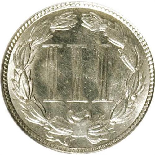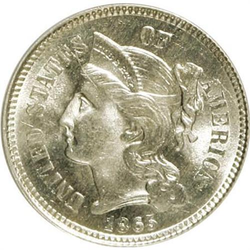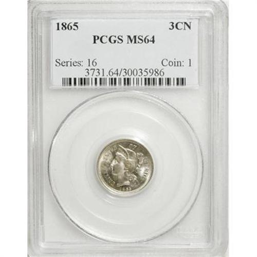 <B>1865 3CN MS64 PCGS.</B></I> PCGS Population (409/150). NGC Census: (478/142). Mintage: 11,382,000. Numismedia Wsl. Price for NGC/PCGS coin in MS64: $200. (#3731)<BR><BR><B>Coin Engraver:</B> James B. Longacre<BR><BR><b>Shipping:</b> Coins & Currency (<a target="_blank" href="http://www.heritageauctions.com/common/shipping.php">view shipping information</a>)