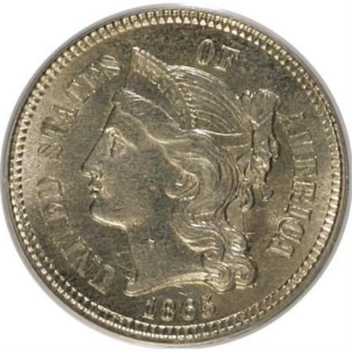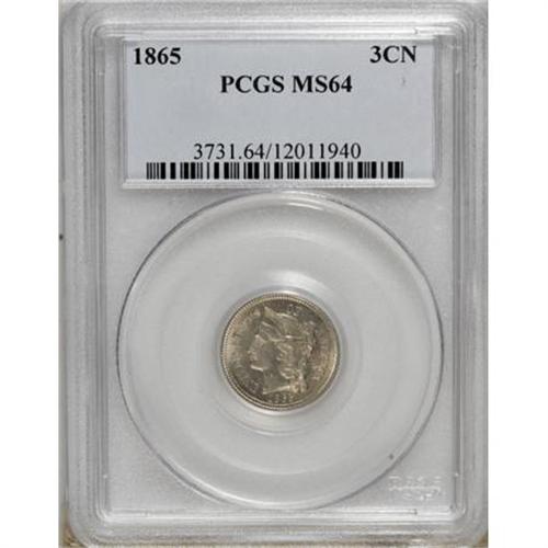 <B>1865 3CN MS64 PCGS.</B></I> . PCGS Population (415/154). NGC Census: (478/144). Mintage: 11,382,000. Numismedia Wsl. Price for NGC/PCGS coin in MS64: $220. (#3731)<BR><BR><B>Coin Engraver:</B> James B. Longacre<BR><BR><b>Shipping:</b> Coins & Currency (<a target="_blank" href="http://www.heritageauctions.com/common/shipping.php">view shipping information</a>)