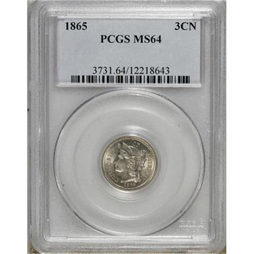 <B>1865 3CN MS64 PCGS.</B></I> PCGS Population (417/156). NGC Census: (480/145). Mintage: 11,382,000. Numismedia Wsl. Price for NGC/PCGS coin in MS64: $220. (#3731)<BR><BR><B>Coin Engraver:</B> James B. Longacre<BR><BR><b>Shipping:</b> Coins & Currency (<a target="_blank" href="http://www.heritageauctions.com/common/shipping.php">view shipping information</a>)