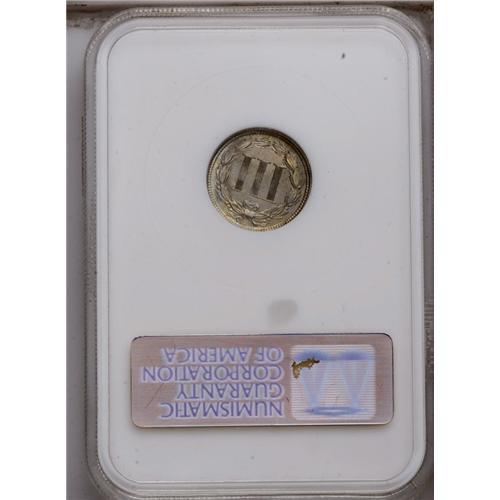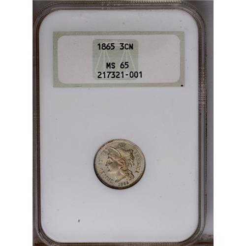 <B>1865<3CN> MS65 NGC.</B></I> Pastel lime and gold tints grace this well struck and lovely Gem. Struck from prominently clashed dies, and housed in a prior generation holder.