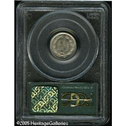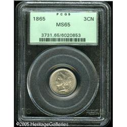 <B>1865 3CN MS65 PCGS.</B></I> This is a wonderful Gem Mint State example with frosty light gray surfaces and fully brilliant luster. It is sharply struck with just the slightest weakness at the centers of III.<BR><I>From The Mike Jacobson Collection.</B></I> Lot:5690