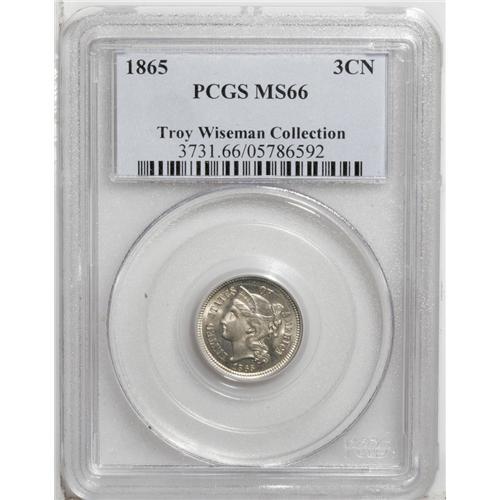 <B>1865<3CN> MS66 PCGS.</B></I> Subtle gray-gold patina covers the lustrous surfaces. The devices display great definition. Population: 30 in 66, 2 finer (8/06).<BR><I>From The Troy Wiseman Collection.</B></I>