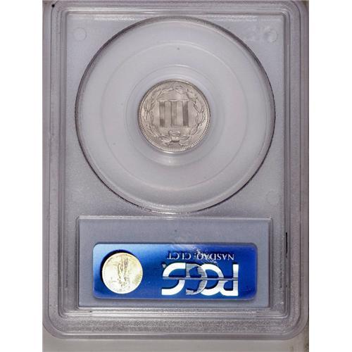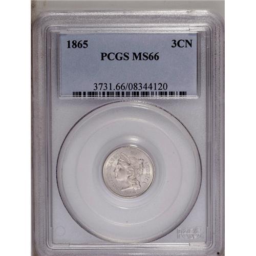 <B>1865<3CN> MS66 PCGS.</B></I> Hints of golden-brown visit this lustrous and essentially immaculate Premium Gem. Slight softness of strike on the columns denies a higher grade. Population: 31 in 66, 2 finer (2/06).