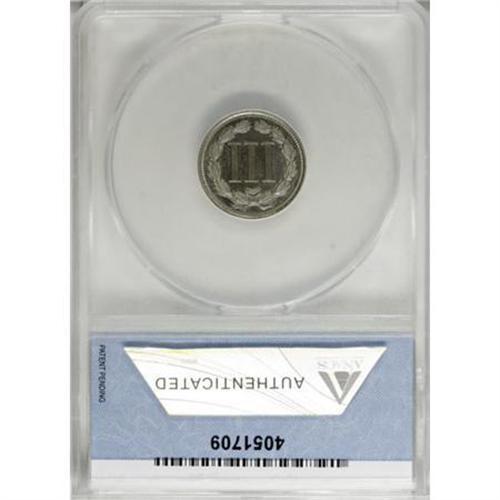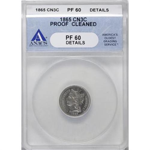 <B>1865 3CN --Cleaned--ANACS. PR60 Details.</B></I> FS-001.5. The date is repunched east, with remnants of all four digits visible west of the peaks of the prominent digits. A lightly hairlined example with minute spots. Along with the 1877, the 1865 is a key to the proof series. Much of the proof mintage of 500+ pieces presumably failed to sell and was melted by the mint.<BR><I>From The John Stimson, Sr. Collection, Part Two.</B></I><BR><BR><B>Coin Engraver:</B> James B. Longacre<BR><BR><b>Shipping:</b> Coins & Currency (<a target="_blank" href="http://www.heritageauctions.com/common/shipping.php">view shipping information</a>)