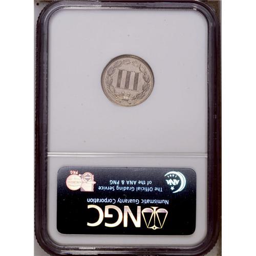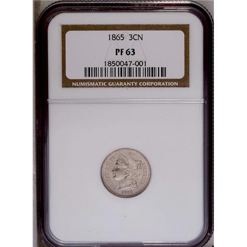 <B>1865<3CN> PR63 NGC.</B></I> The date is broadly repunched east. An intricately struck and lightly toned specimen with slightly cloudy fields. As a business strike, the 1865 is the most common of the series, since more than 11 million pieces were struck. However, proofs of this inaugural date are the toughest of the series. The <I>Guide Book</B></I> reports a mintage of 500+ pieces, and the low third-party populations confirm this stingy production.