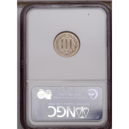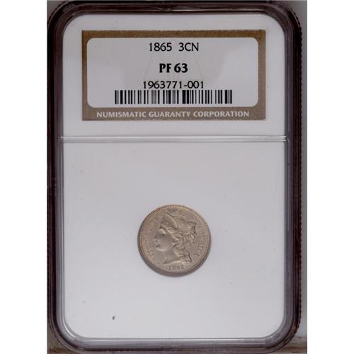 <B>1865<3CN> PR63 NGC.</B></I> The key date of the proof series. A bold and unmarked specimen with a thin, vertical, mint-made planchet streak at 5 o'clock on the reverse. The date is broadly repunched.