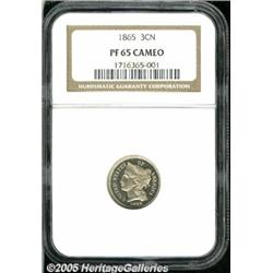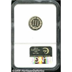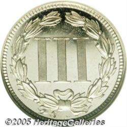 <B>1865 3CN PR65 Cameo NGC.</B></I> Nicely contrasted and generally bright overall. We note a few tiny specks in the fields, visible only at certain angles. A well struck Gem for the collector. The date shows strong repunching as seen on about 90 percent of these first year of issue proofs. The elusiveness of this issue is apparent from the population figures. As of February, only 33 examples have been certified by NGC and PCGS combined, with 30 finer. Population: 20 in 65, 12 finer (2/05).