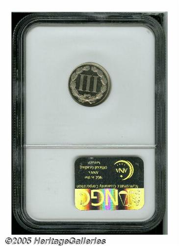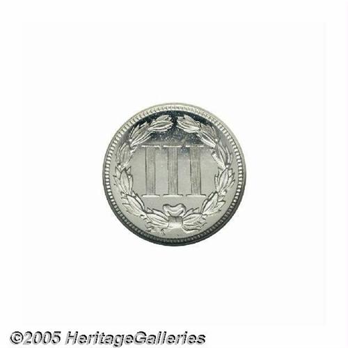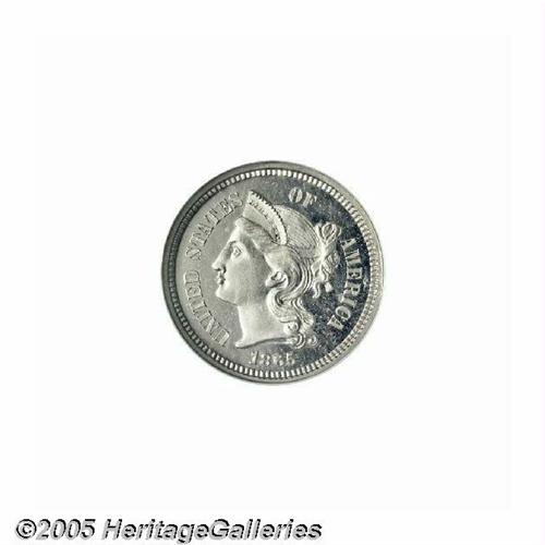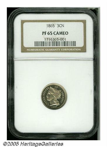 <B>1865<3CN> PR65 Cameo NGC.</B></I> Nicely contrasted and generally bright overall. We note a few tiny specks in the fields, visible only at certain angles. A well struck Gem for the collector. The date shows strong repunching as seen on about 90 percent of these first year of issue proofs. The elusiveness of this issue is apparent from the population figures. As of May, only 23 Cameo examples have been certified by NGC and PCGS combined, with 29 finer. Population: 10 in 65 Cameo, 11 finer (5/05).