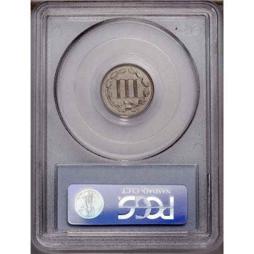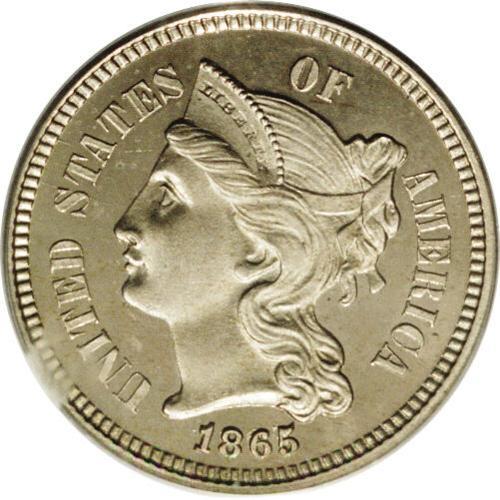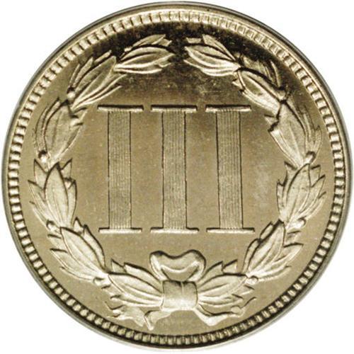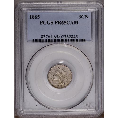 <B>1865<3CN> PR65 Cameo PCGS.</B></I> Lightly frosted motifs stand out nicely against mirrored fields. The design elements are sharply impressed, including strong definition on the beads in Liberty's coronet and in the lines of the Roman numeral III. Bright proof surfaces display whispers of faint sky-blue and olive-green toning under magnification, and some light flecks are scattered over each side. No contact marks of any consequence are visible. Population: 19 in 65, 20 finer (2/06).