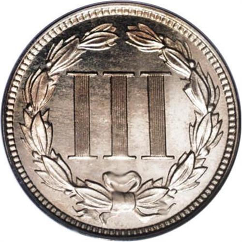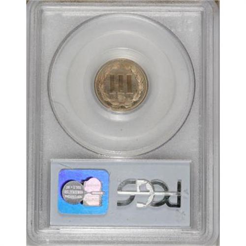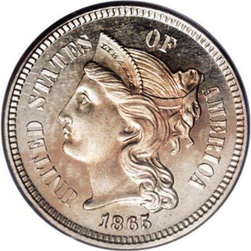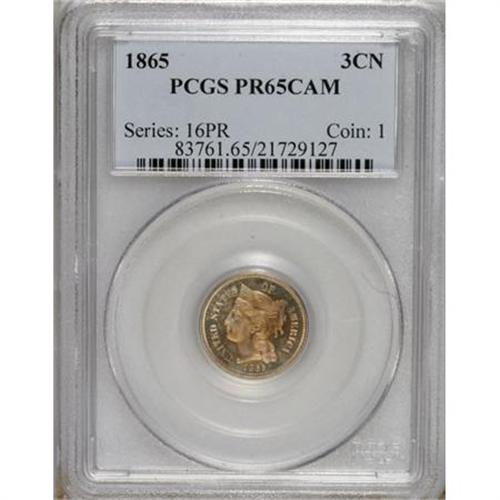 <B>1865 3CN PR65 Cameo PCGS.</B></I> One of two candidates for the lowest-mintage proof three cent nickel issue, alongside the proof-only 1877, both of which have estimated mintages of slightly over 500 pieces. Strongly reflective with pleasing detail and distinct contrast evident on each side, particularly the gold-tinged reverse. A large area of the portrait exhibits vibrant sunset-orange color as well. Population: 18 in 65 Cameo, 24 finer (4/07).<BR><BR><b>Shipping:</b> Coins & Currency (<a target="_blank" href="http://www.heritageauctions.com/common/shipping.php">view shipping information</a>)